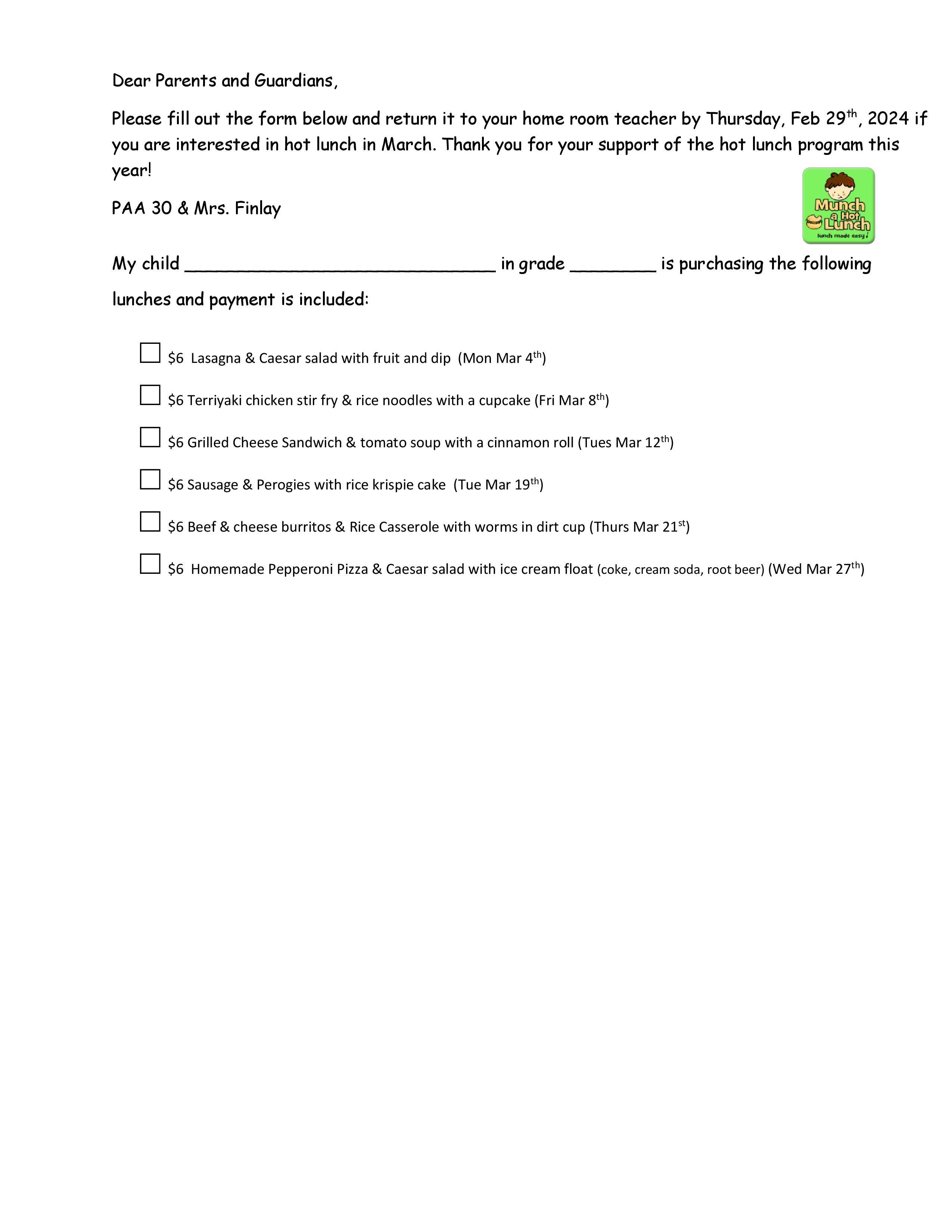 March hot lunch form