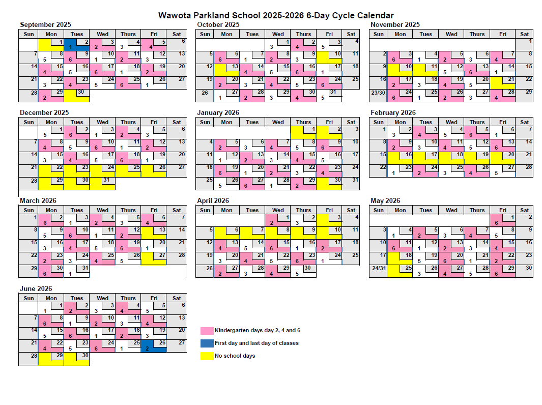 Wawota Parkland School 2025-2026 6 Day Cycle Calendar
